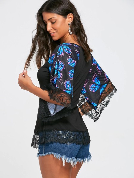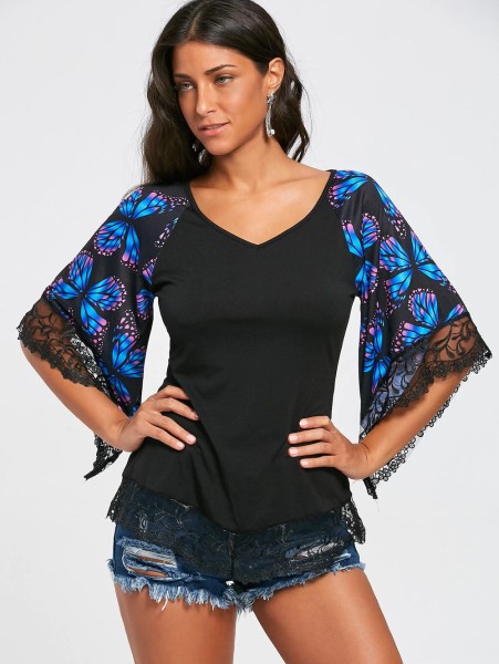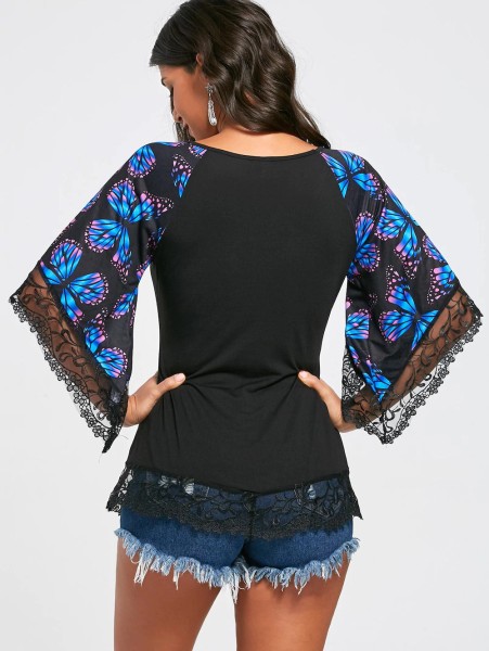 Butterfly Raglan Sleeve Lace Trim T-shirt - Blue-0