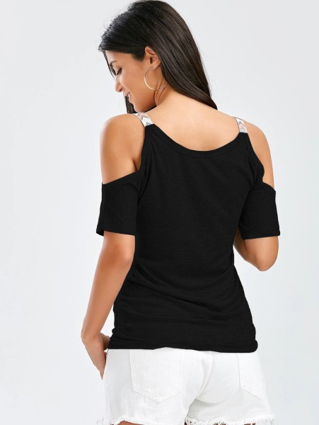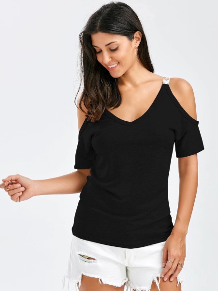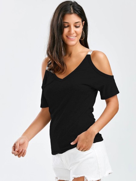 Description text. Product: V Neck Cold Shoulder Tee - Black-0